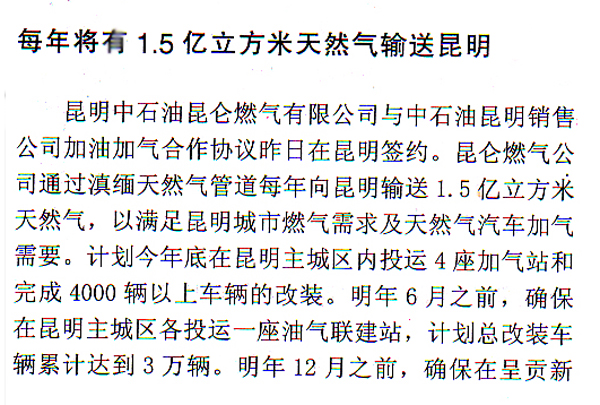 位置导航: 首页业界资讯→每年将有1.5亿立方米天然气输送昆明